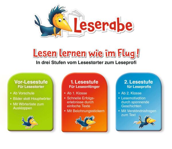 Lesen lernen wie im Flug! Die Kinderbücher der Reihe Leserabe – 1. Lesestufe wurden mit Pädagogen entwickelt und richten sich an Leseanfänger ab der 1. Klasse. Kurze Texte in großer Fibelschrift sichern erste Leseerfolge und steigern die Lesekompetenz von Mädchen und Jungen ab 6 Jahren. Mit Belohnungsstickern.