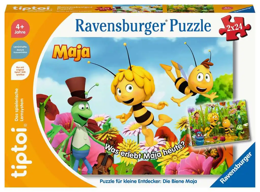 Wo lebt die Biene Maja? Wie heißt ihr bester Freund? Und was für ein Abenteuer erlebt sie heute? Wenn das Puzzle zusammengesetzt ist, gehen die Spieler mit tiptoi auf Entdeckungsreise und tauchen in die Welt von Biene Maja ein. Spannendes Wissen über die neugierige Biene und ihre Freunde, sowie lustige Spiele runden das Puzzle-Erlebnis ab. Auf der Klatschmohnwiese gibt es viel zu entdecken! Der Puzzlespaß im Doppelpack mit 2×24 Teilen fördert zudem die Motorik und die Konzentration.
